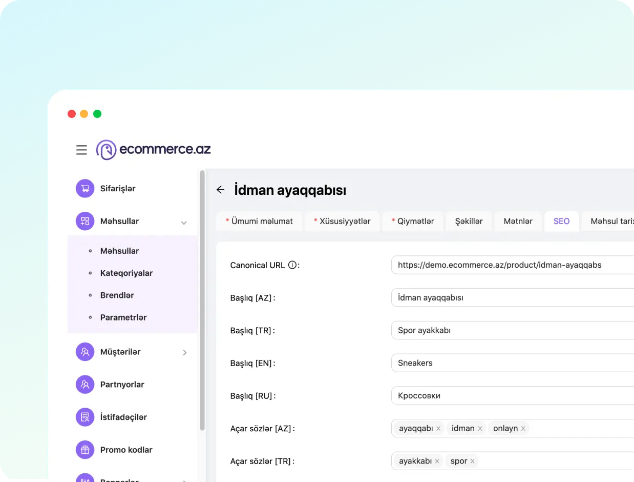 Axtarış sistemlərində maksimum görünürlük üçün güclü SEO modulu. Avtomatik meta taglar, SEO-a uyğun URL strukturu və səhifə optimizasiyası daxildir.